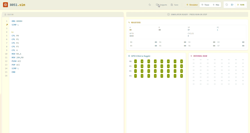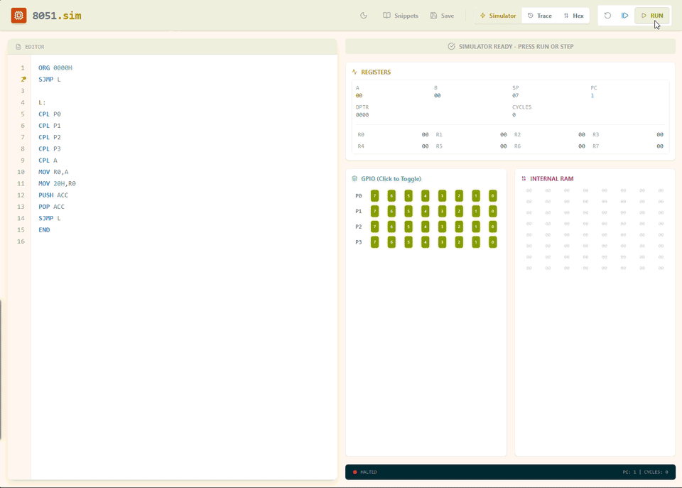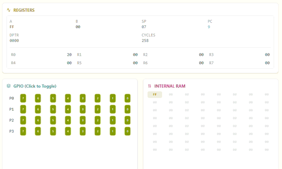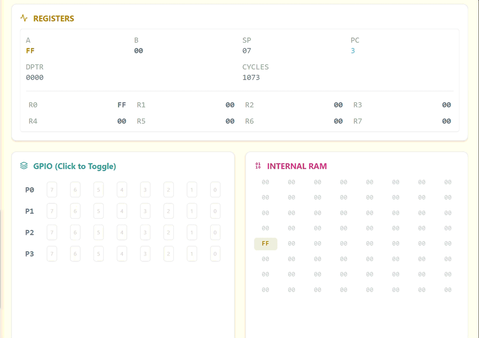 This repository is tightly integrated with a web-based 8051 Assembly Language Simulator, built to execute, debug, and analyze programs written for the Intel 8051 architecture.